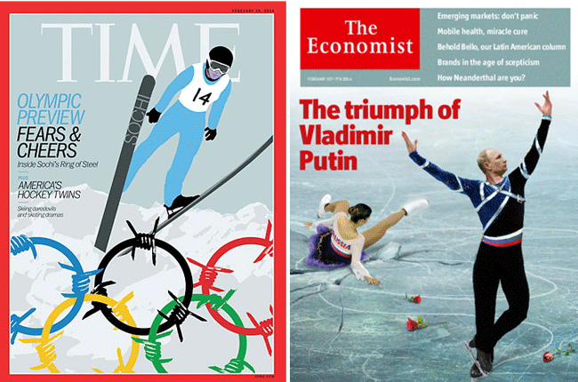 Так, американский еженедельник The New Yorker и английский журнал The Economist разместили на своих обложках похожие карикатуры, на которых российский лидер изображен в образе фигуриста.