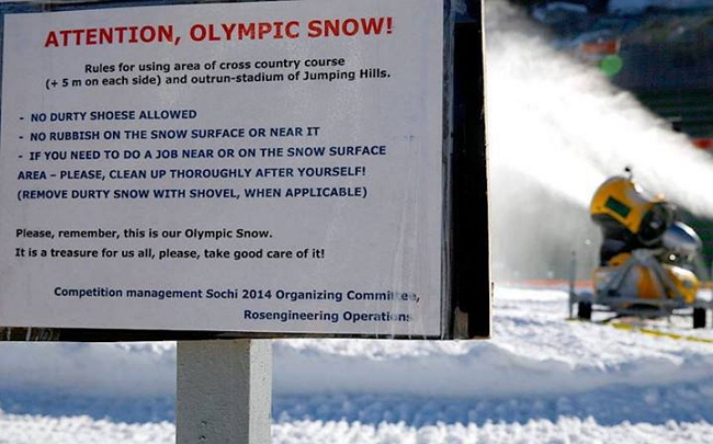 Например, Рустем Адагамов выложил фото объявления у места, где насыпают искусственный снег. Авторы плаката на очень странном английском призывают беречь "наше сокровище – олимпийский снег".