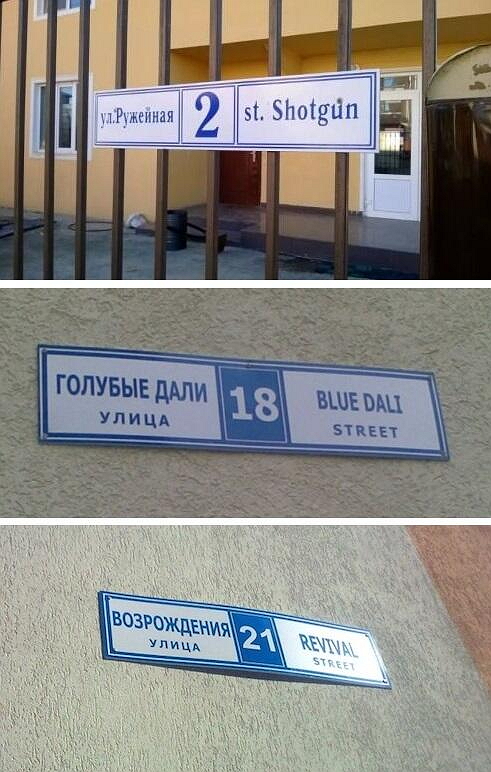 Особенно переводчики постарались над улицей Голубые Дали, ставшей Blue Dali Street. Но больше всего не повезло улице "50 лет СССР": на соседних домах появились таблички с надписями "50 years USSR", "50 let SSSR" и "50-letiya USSR", пишет Km.ru.